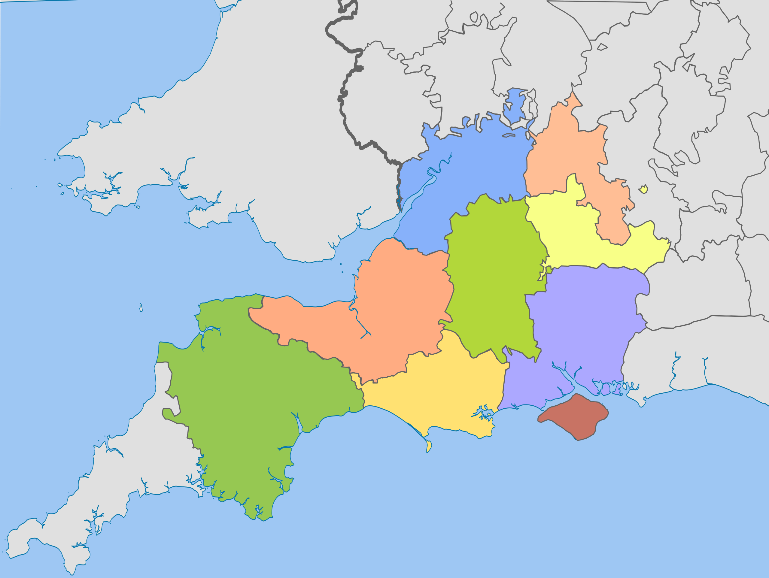 ceremonial counties in the region: Berkshire, Bristol, Devon, Dorset, Gloucestershire, Hampshire, the Isle of Wight, Oxfordshire, Somerset, and Wiltshire