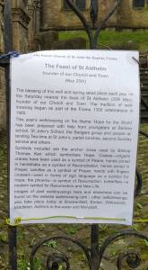 Frome is a town founded by Ealdhelm, and which has not allowed his memory to be erased. There are at least half a dozen uses of his name (using the Mercian spelling, Aldhelm) within the town, including a pharmacy and a print works named after him. The church, however, is dedicated to St John the Baptist. This should not surprise us if the church was founded by Ealdhelm himself, as he would not have been a saint when the church was dedicated, and would not have dedicated a church in his own name. The church did have a notice on display detailing the saint’s life, however, and had dressed its well, an annual tradition on his feast day.