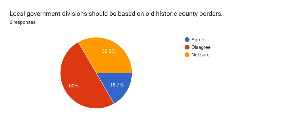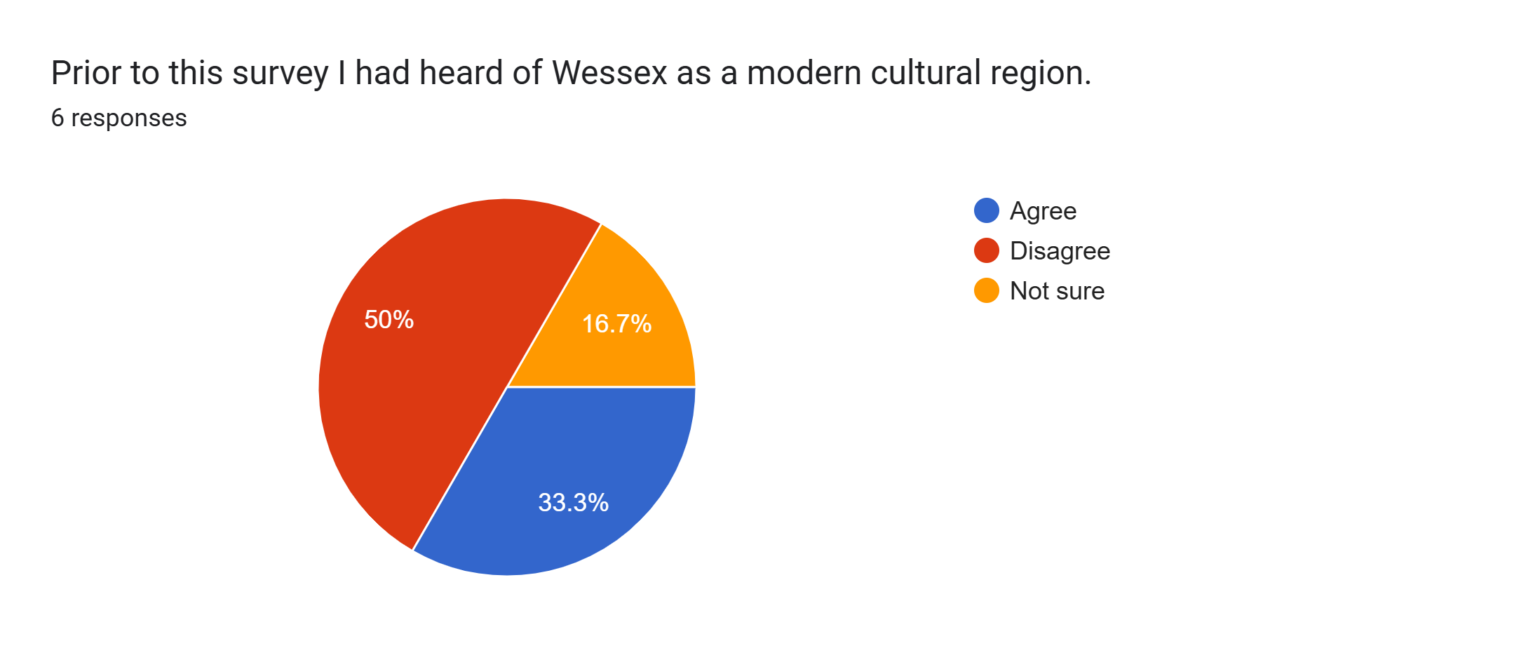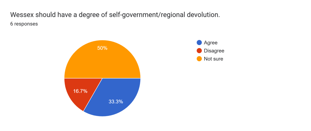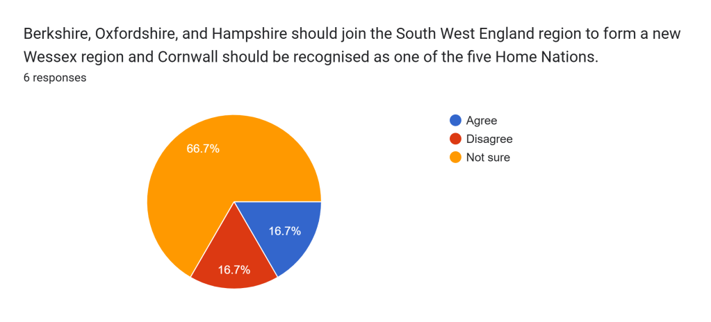 Survey-answerers were split three ways between ‘agree,’ ‘disagree,’ and ‘not sure’ on the question of whether Berkshire, Hampshire, and Oxfordshire, recognised by the Wessex Society as part of Wessex, had more in common with the South West than the South East. At the time of administrative regionalisation, the Wessex Constitutional Convention proposed taking these three regions from the South East into the South West, the latter to be renamed ‘Wessex.’ Nonetheless, half were in agreement that “a regional system including ‘Wessex’ is preferable to one based on the ‘South West England’ and ‘South East England regions,’ with the other half responding ‘not sure.’ This suggests there is ground to be won regarding the Party’s definition of boundaries and borders.